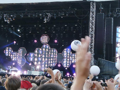 ...saan tehdä reissun Helsinkiin, ajaa edestakas Manskua kympin ratikalla, halata monia ihania ystäviä ja mitäs vielä... ai niin, fiilistellä lavalla soittelevaa lempibändiäni Musea Monsterin ja muiden kamujen ja 20 993 tuntemattoman toverin kanssa Kaisaniemen pilvettömän sinisen taivaan alla. Keikassa oli ehkä lievää rutiinin makua, mutta mitäpä tuosta, kyllä mulle hittiputkikin kelpasi. Ens kerralla vaan on pidettävä huolta, että pääsee hiukan lähemmäs lavaa - olihan se nyt iha mälsää, kun esim. Plug In Babyn perinteinen pomppurintama ei ulottunut meihin asti.